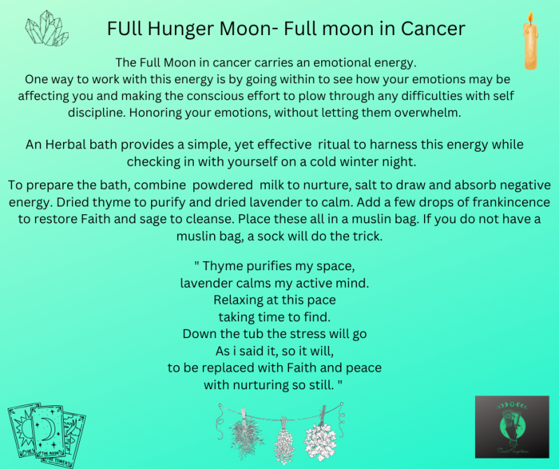 People honor the full moon in many ways. It is important to forge your own connections. Some tend to think that they MUST do something, when in reality, It comes down to your own well being and what feels right to you. Some choose to use this energy to charge their crystals under the moonlight, while others will set out a cup of water to be drank in the morning. Others will meditate, while some will perform rituals. The important thing to remember is that you can do any of the above; or none at all.... and thats ok. If you are interested in learning, however, the following suggestion is a way to provide some self care on a cold winters eve....